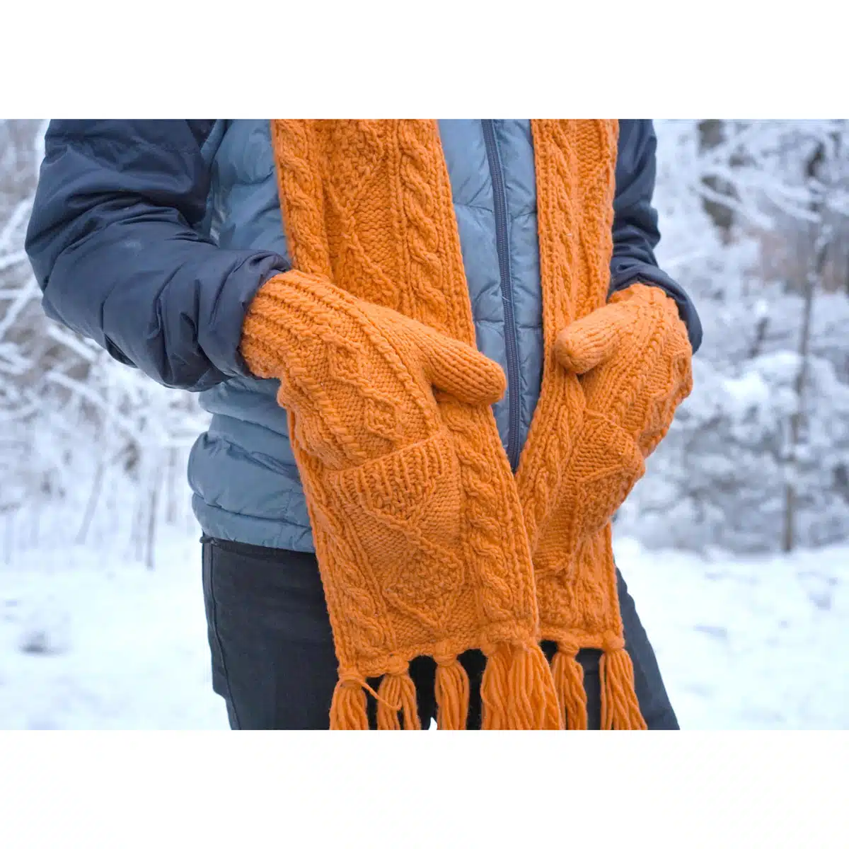 Made with ultimate warmth, style, and function in mind. Ends have pockets for extra hand warmth, or keeping small accessories close at hand. Wool with fleece lining. Variety of colors available. Made in Ecuador.