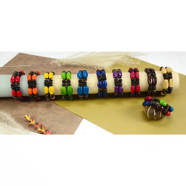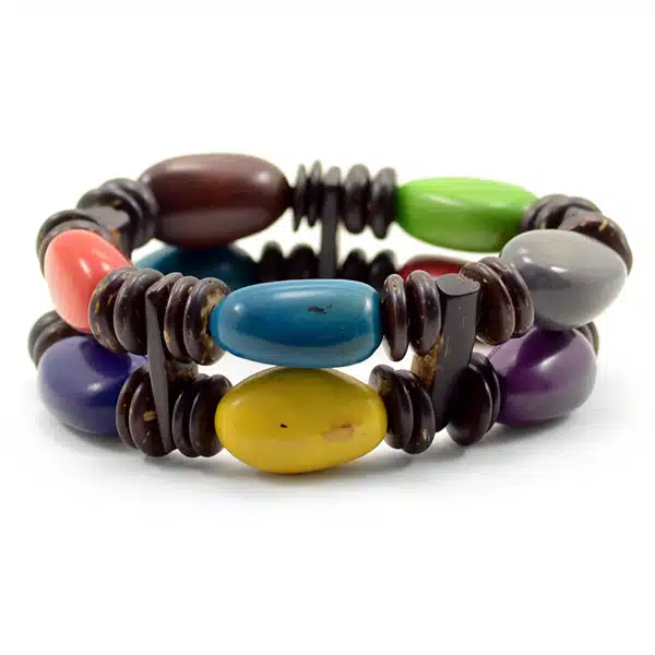 Two symmetrical strands of colorfully dyed bisola (taguilla) and coconut beads on durable elastic. Choose a wide variety of solids or multi. Made in Ecuador.