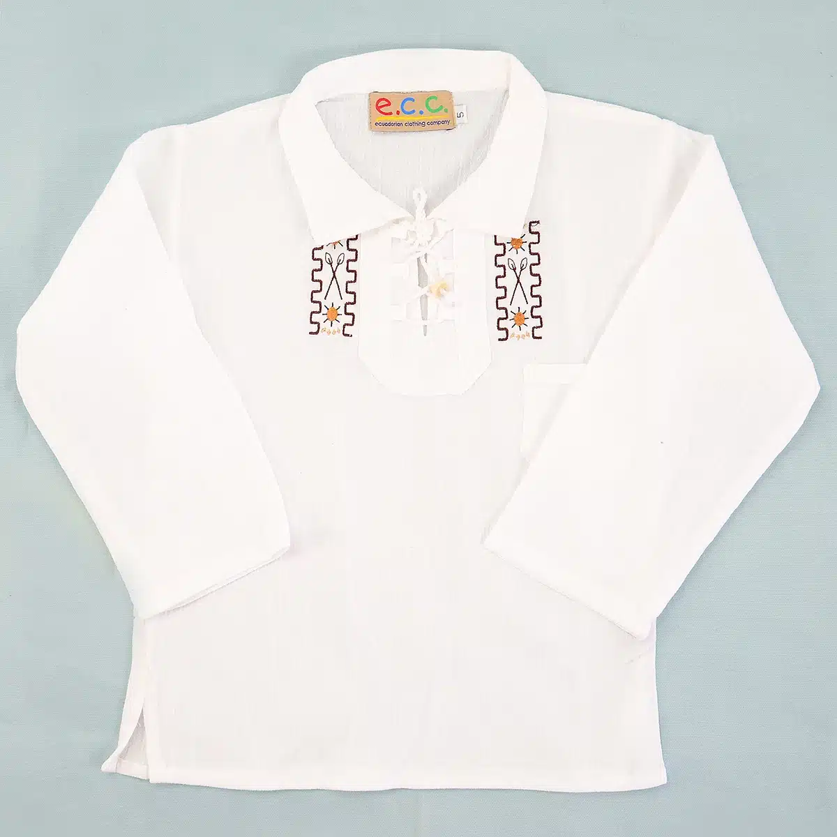 A variety of traditional South American motifs on white cotton. Lace up collar. Available in sizes 1, 3, & 5. Made in Ecuador