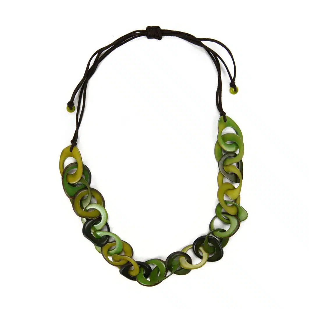 Slices of tagua are beautifully dyed and strung together in a chain for this stylish statement necklace. Has an adjustable sliding closure 20"-34". Matching earrings: #23431E Full set: #23431