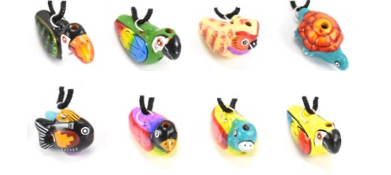Hand-painted ceramic animal whistles. Hung on an 11" nylon cord. Height: 1.75-2". Made in Perú.