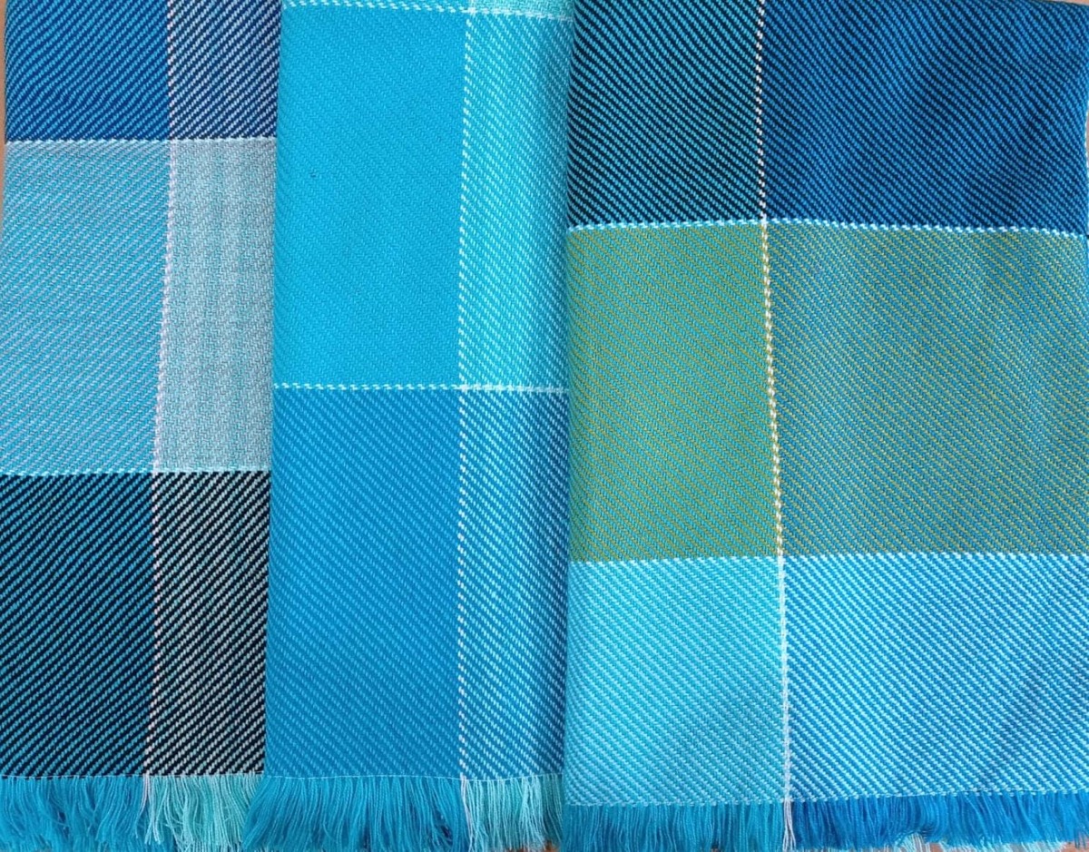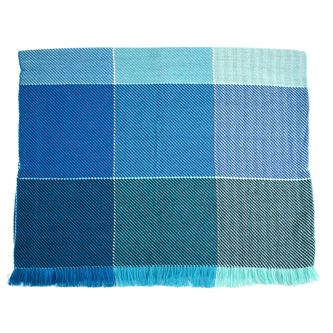 Stylish checkered shawl made with with 100% Acrylic. Comes in various turquoise tones. Made in Ecuador.