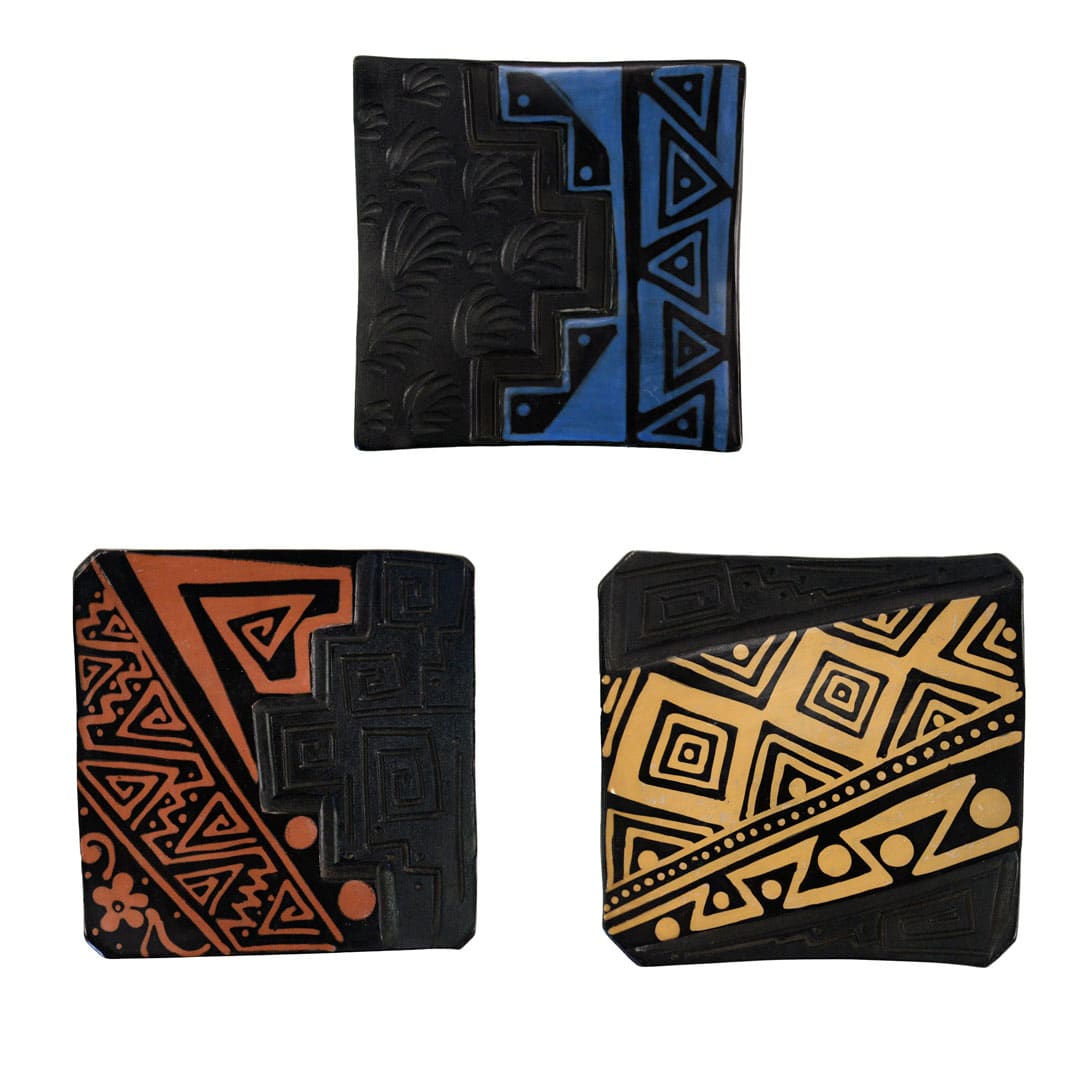 Square Chulucana plates for decorative use. Available in a variety of patterns and colors.Made in Peru.