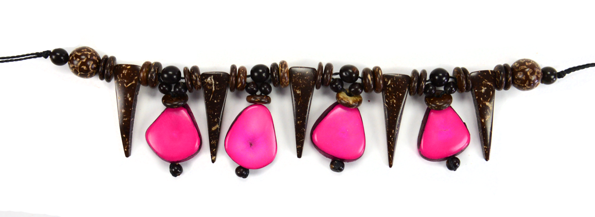 Thick slices of tagua in bright colors accompany coconut beads. Adjustable sliding closure.