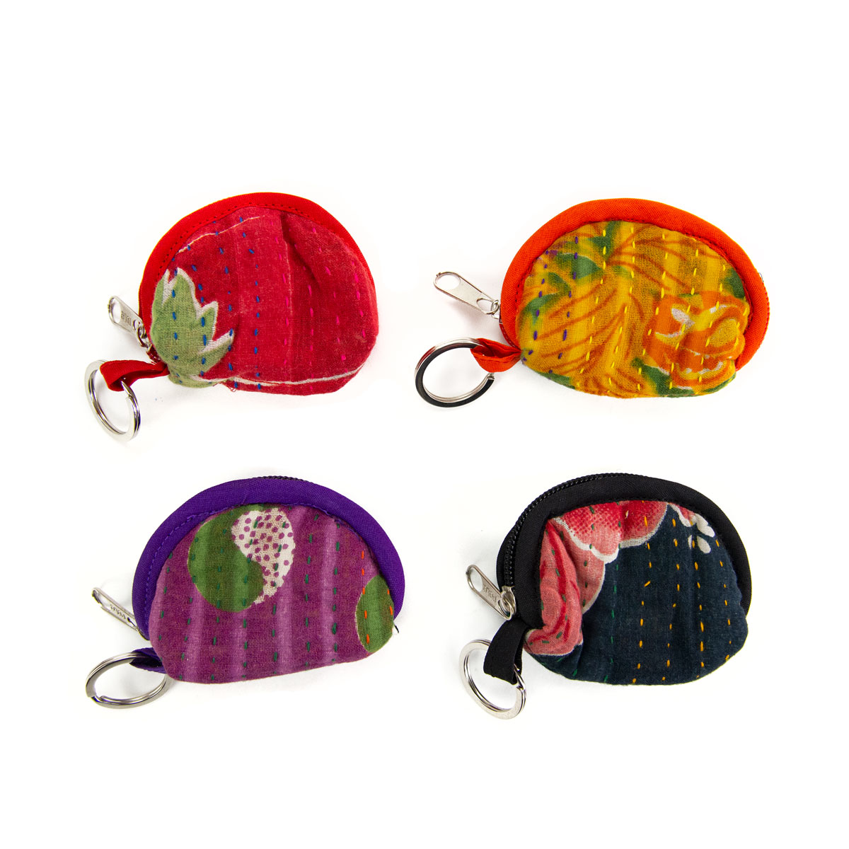 This handy little cotton coin pouch is made from recycled cotton saris with a cotton lining and quality key ring. The colors and patterns will vary. Made in Bangladesh.