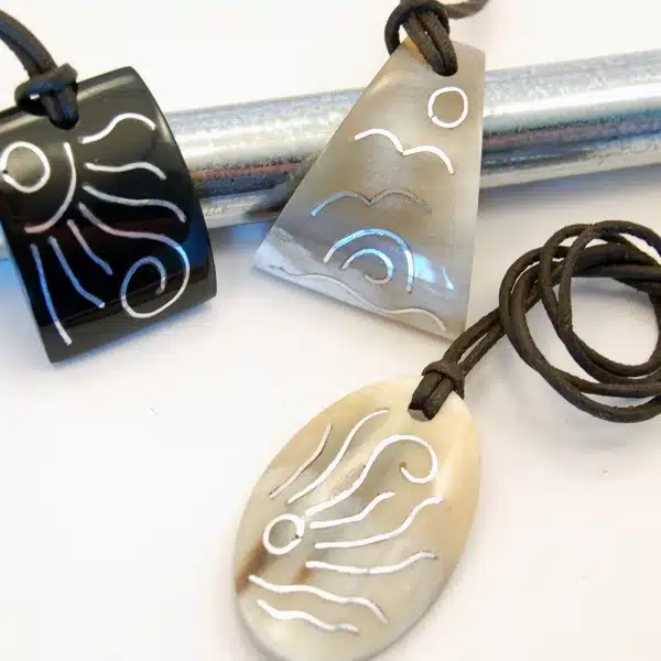 Ground coconut shells or horn are molded in various shapes to create these pendants. Each piece is then engraved and inlaid with thin strands of aluminum and polished until it shines. A wide variety of patterns and shapes available. Made in Ecuador.