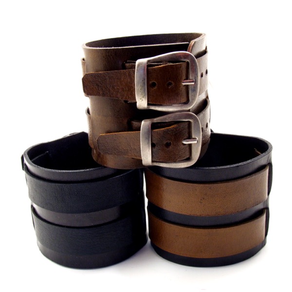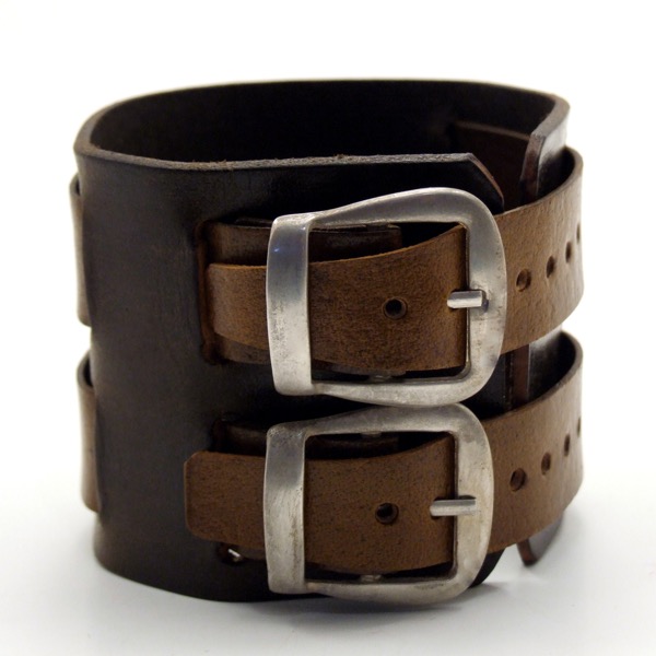 An edgy, rock and roll leather cuff with two buckle closures. Made in Ecuador.