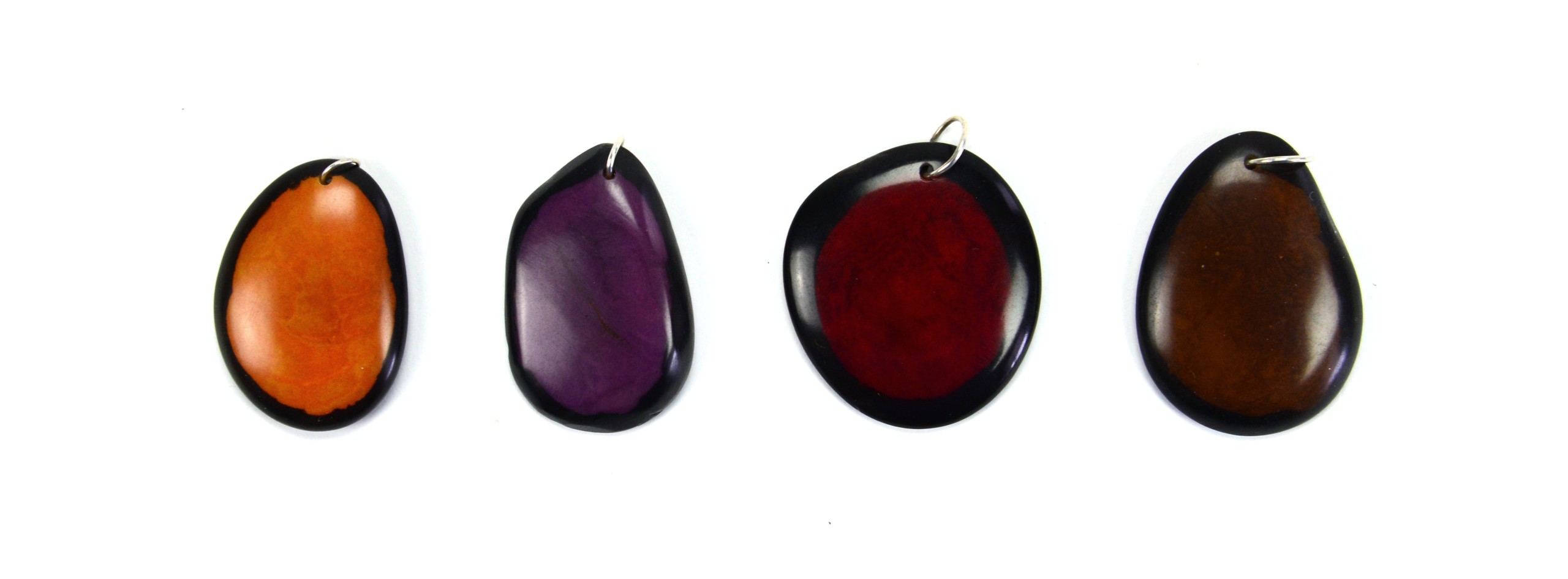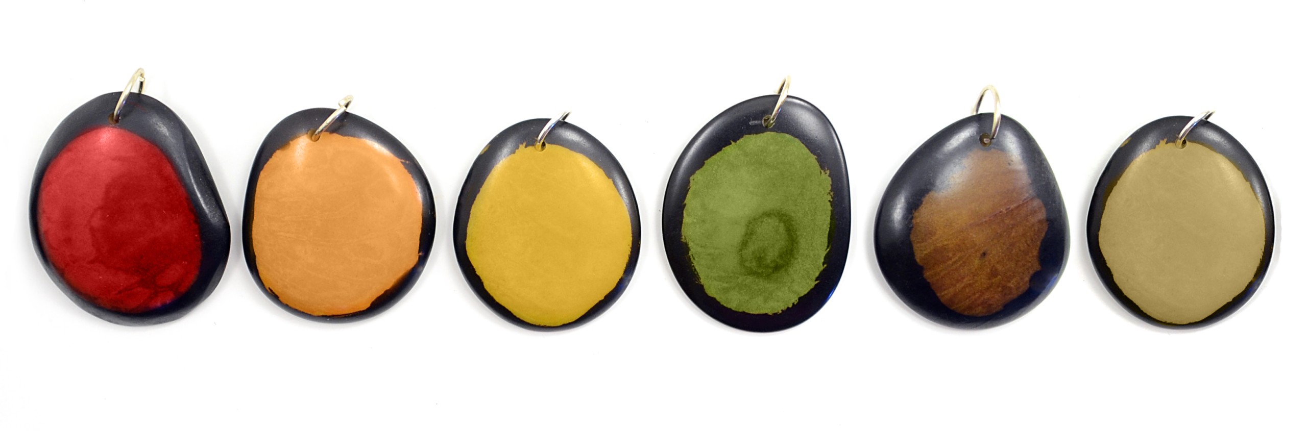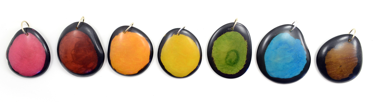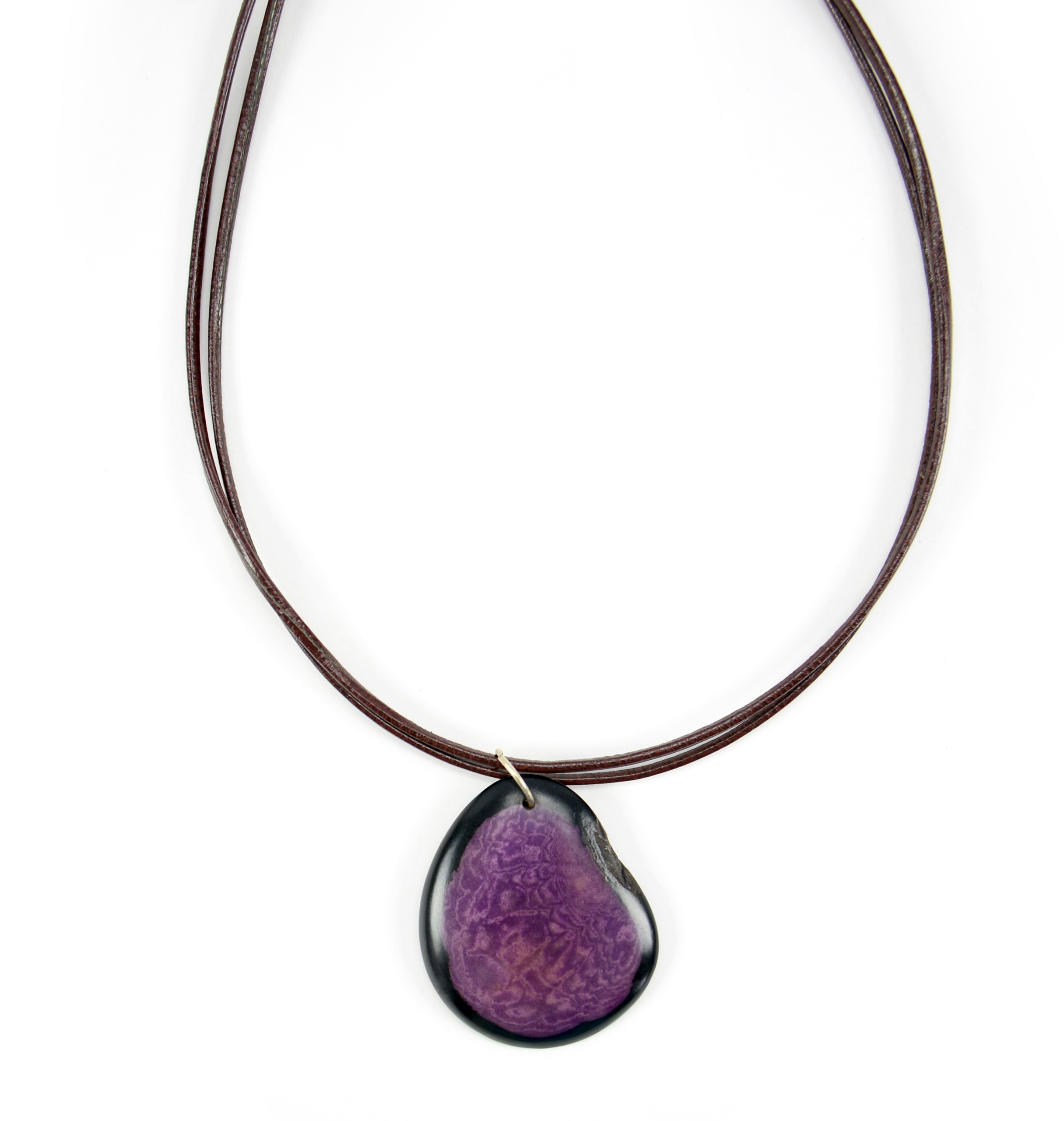 A cross-section of double-dyed tagua. Comes with a double strand leather necklace. Adjustable lobster clasp. Made in Ecuador. Receive an assortment or indicate color preferences in the Product Notes Box. Assortment includes Purple, Pink, Red, Orange, Yellow, Green, Turquoise and Brown.