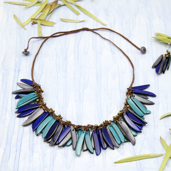 Little tagua "feathers" elegantly hang with skillfully arranged beads which add a measure of sophistication. Adjustable sliding closure 12"-36". Made in Ecuador. Matching earrings: #23350E Full set: #23350