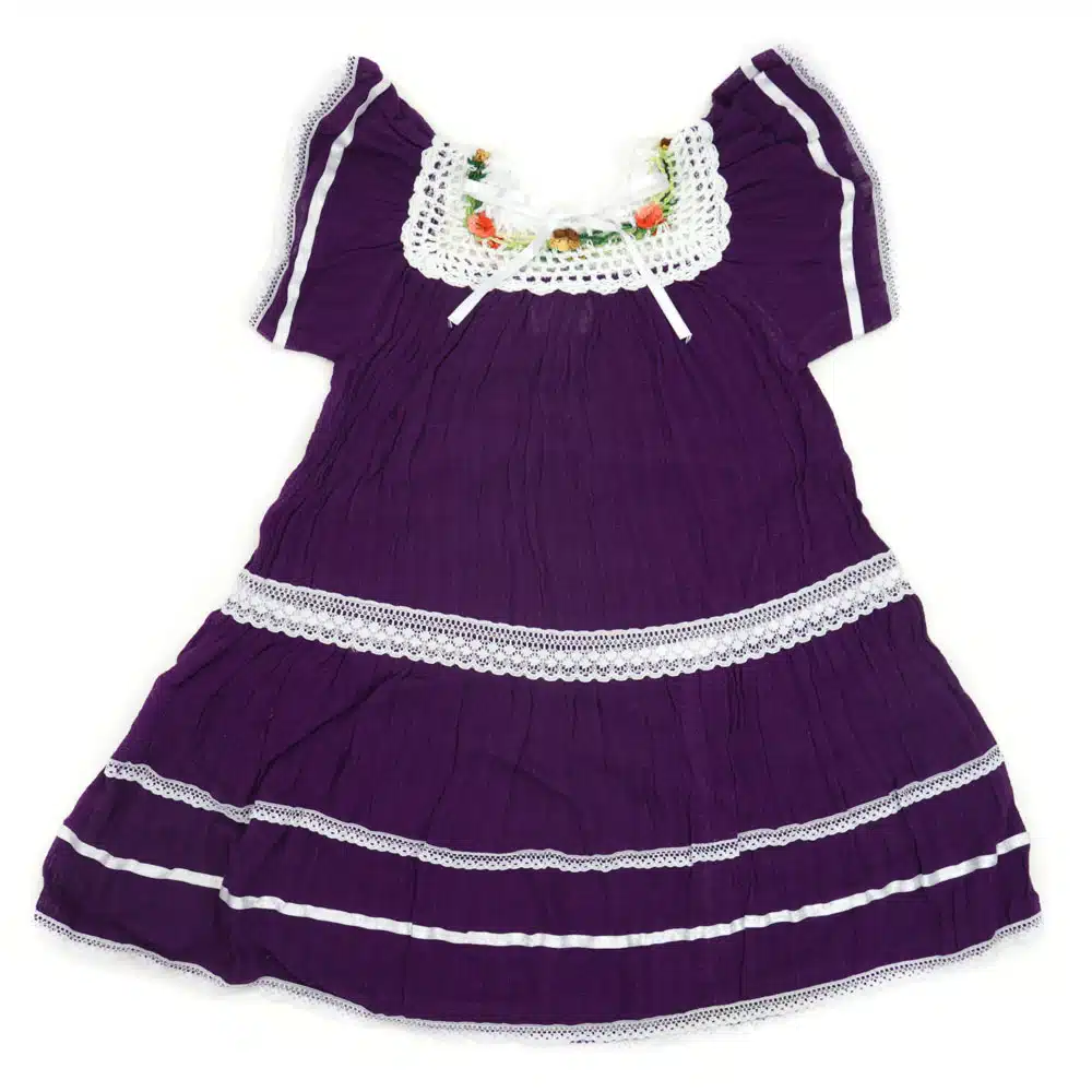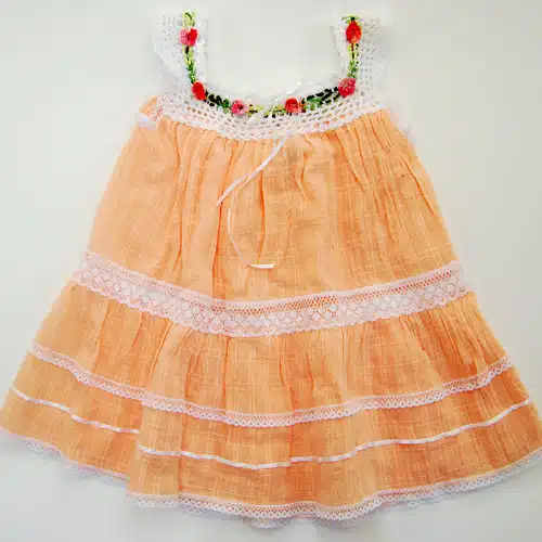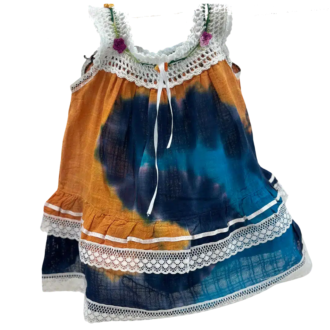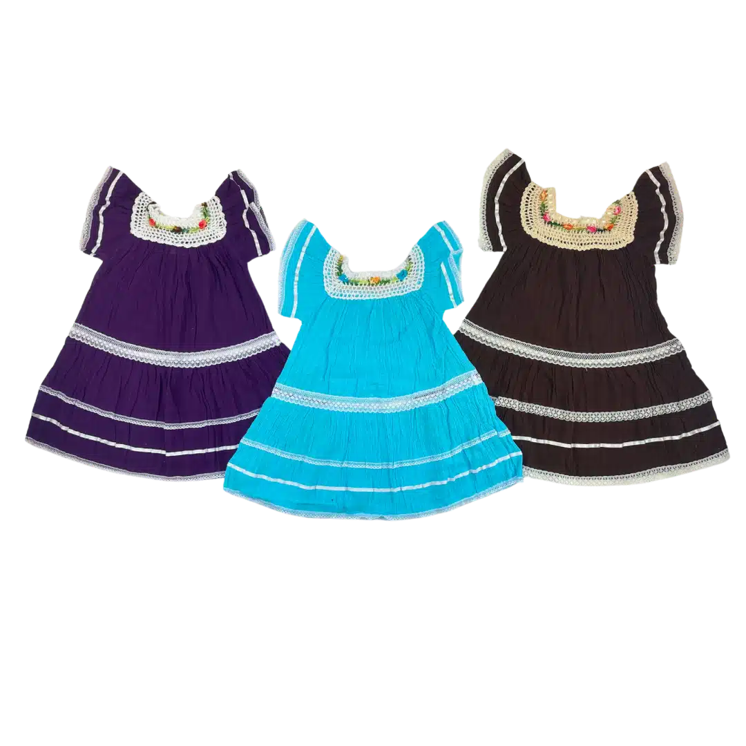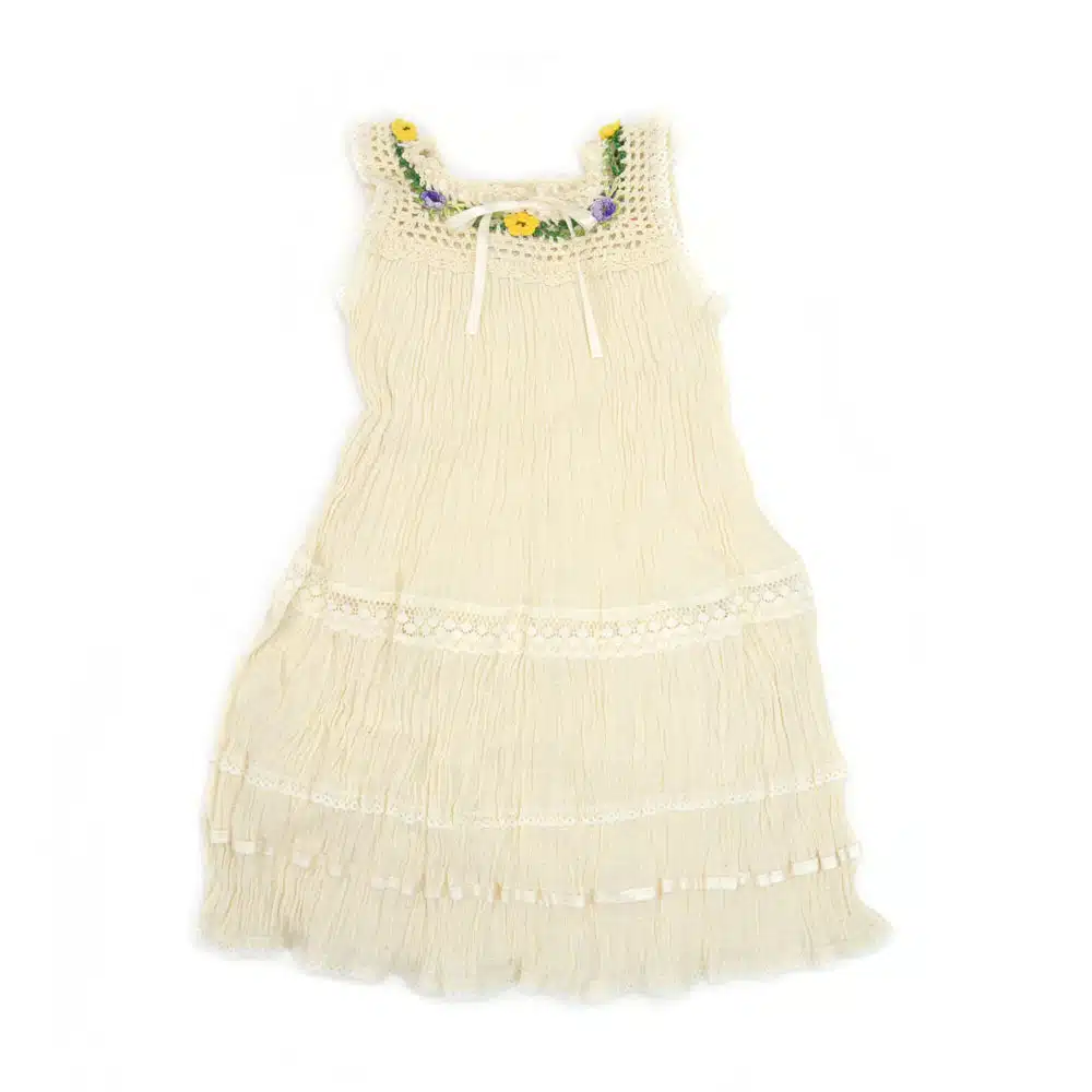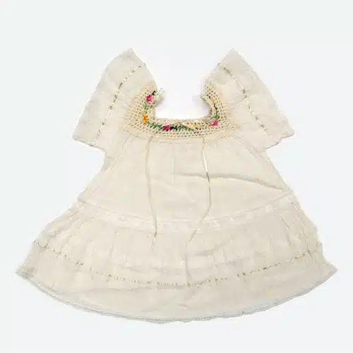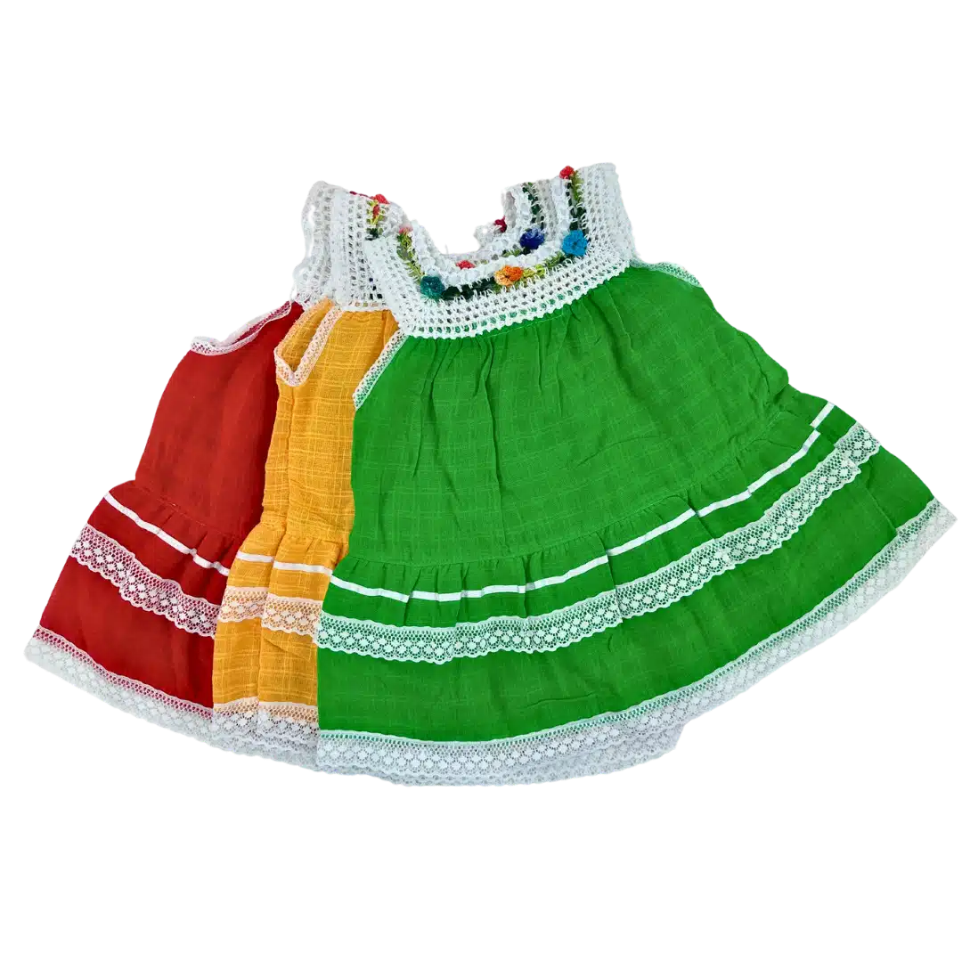 Crocheted flower detail at neck. Cotton with acrylic lace. Available with cap sleeves and strap sleeves. Sizes 0, 2, 4 and 6. Available in a variety of colors. Made in Ecuador.