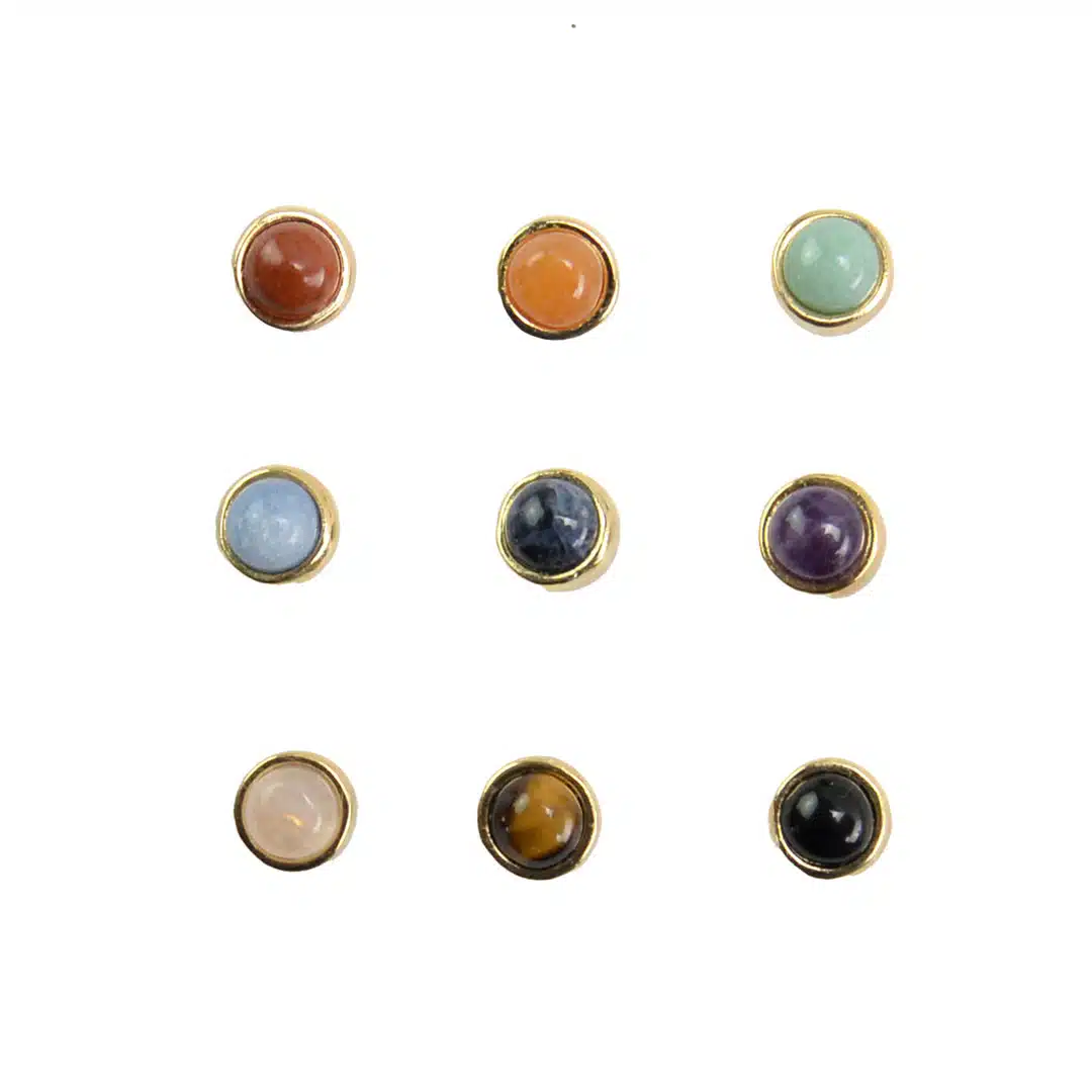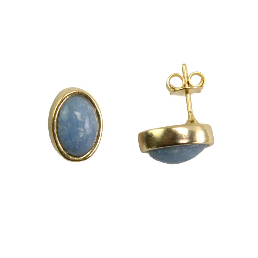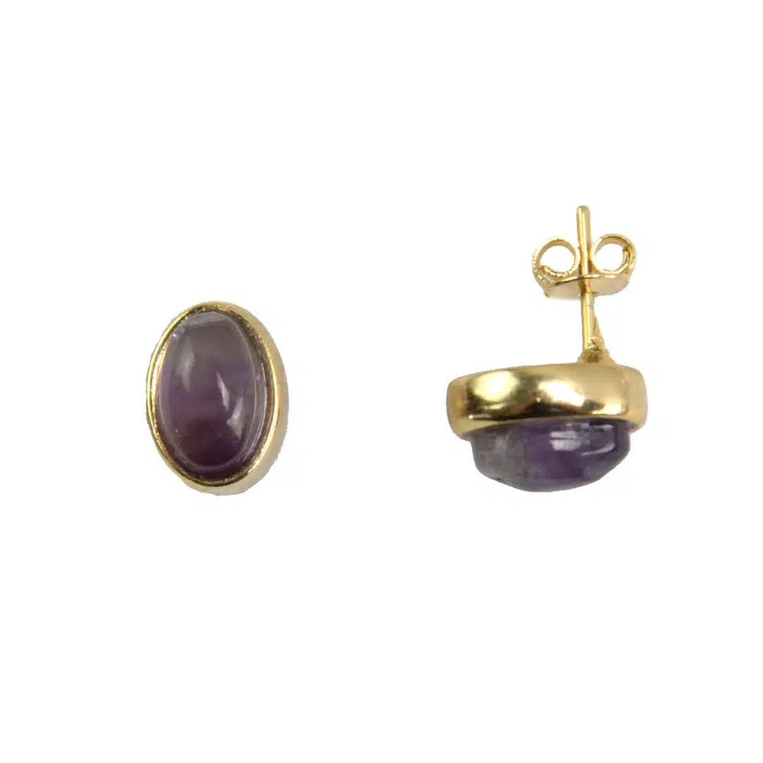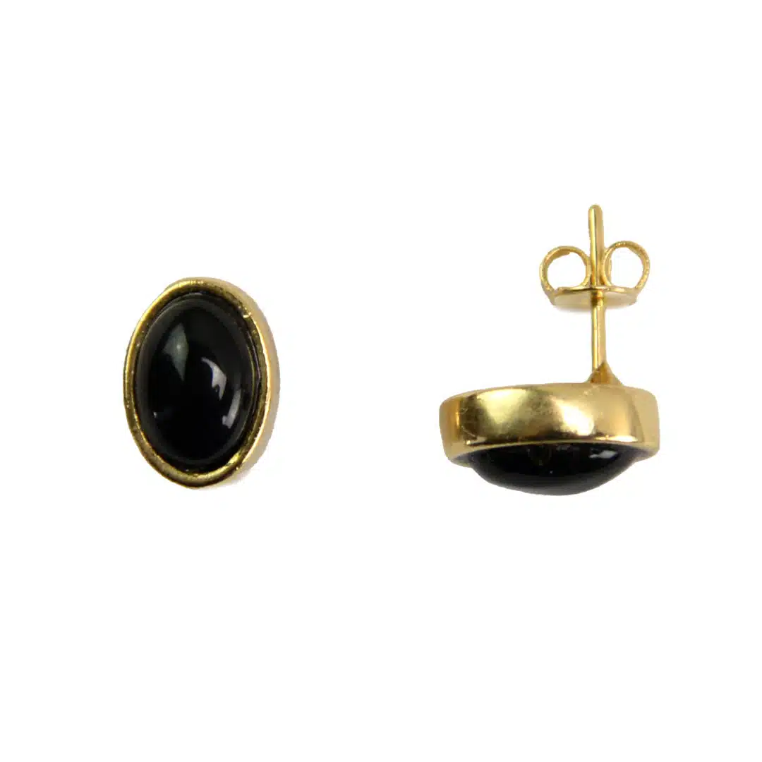 Tasteful 6 mm gold plated studs featuring semiprecious stone. Available in oval or circle styles. Made in Brazil.
