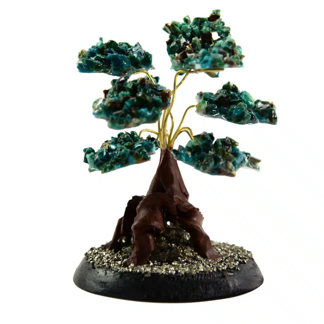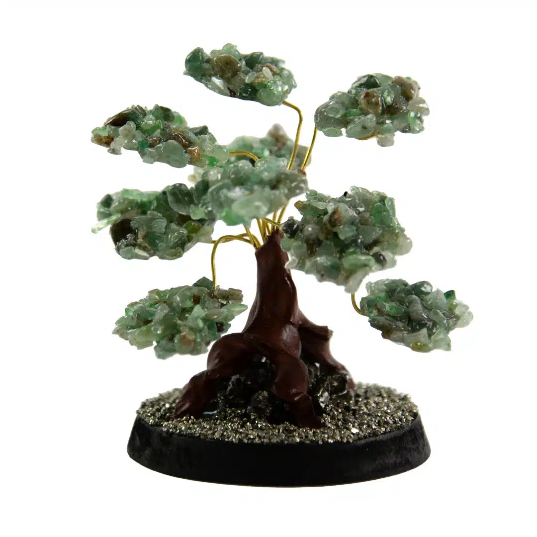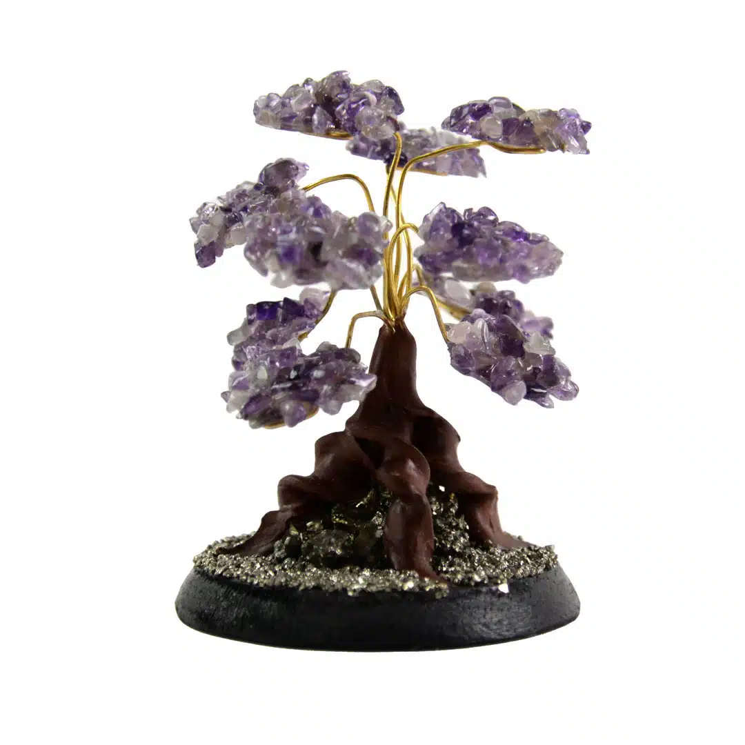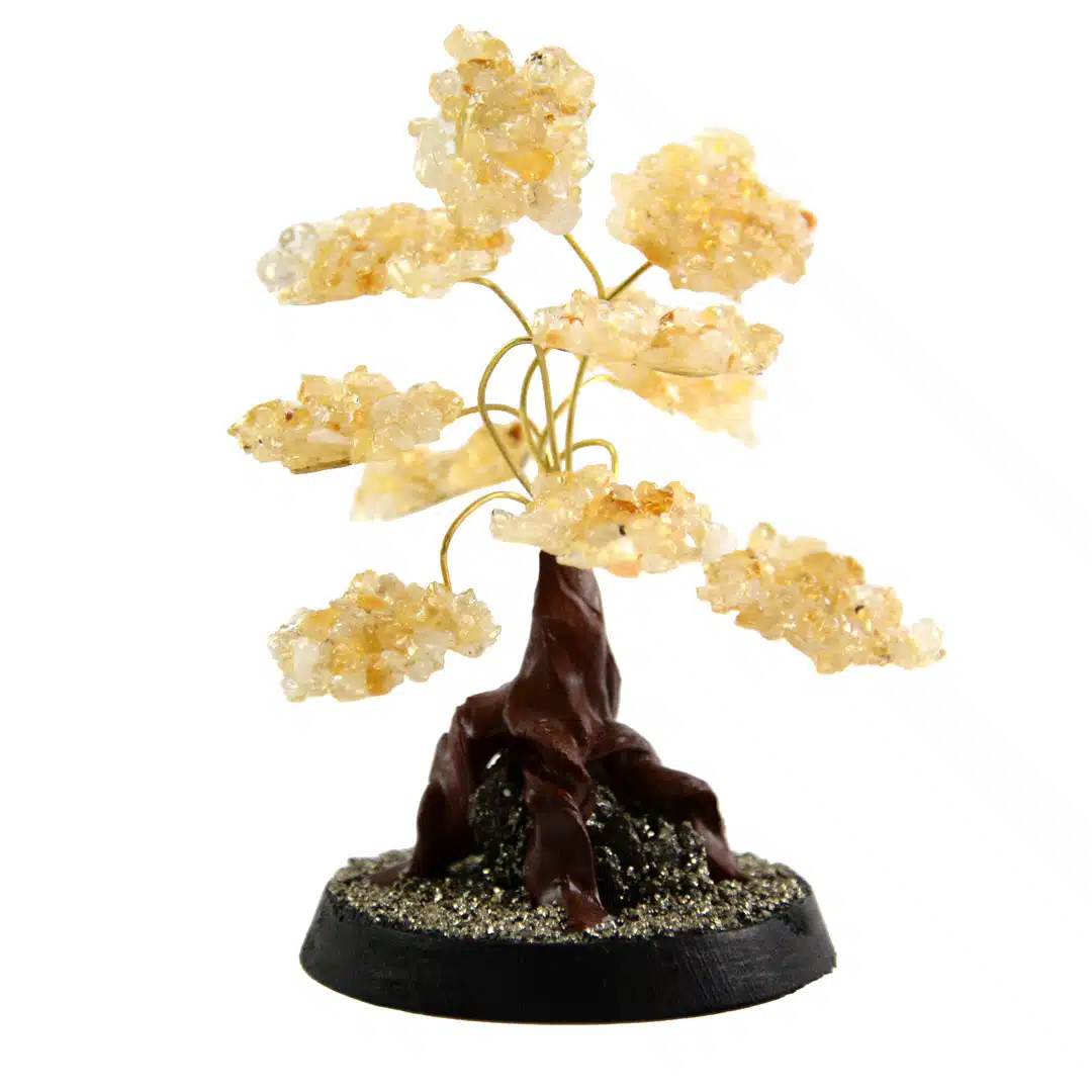 Gilded stone trees made with semi-precious stone clusters. Adjustable wire branches with pyrite and wooden stand. Made in Perú.