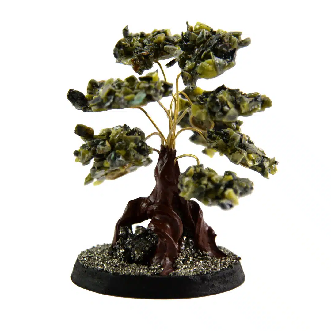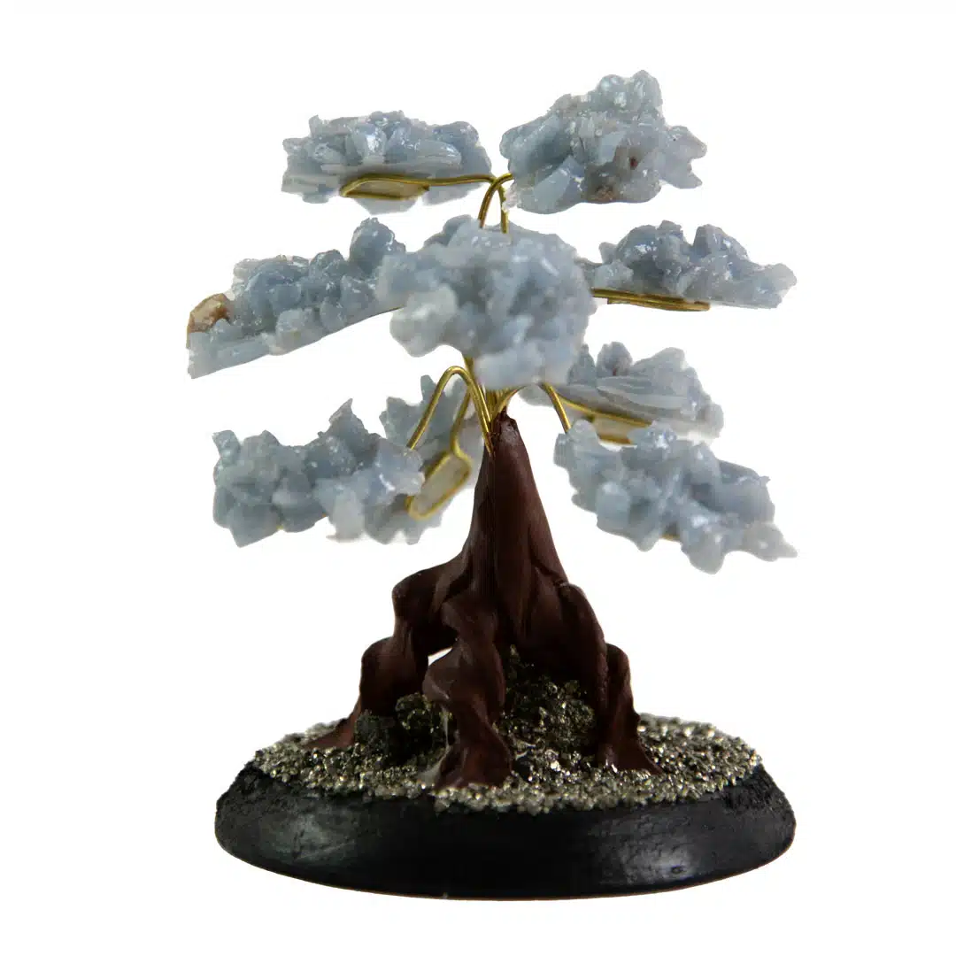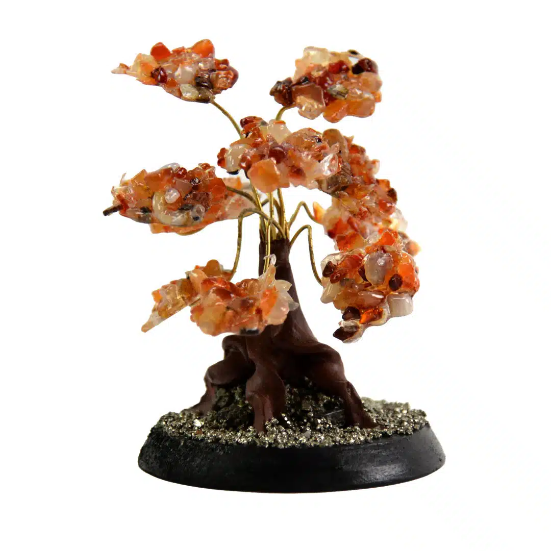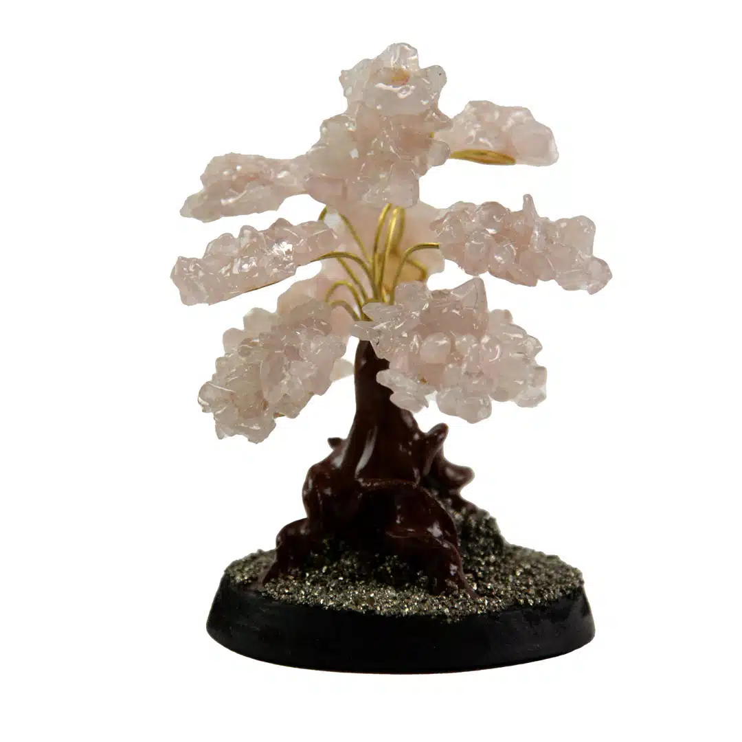 Gilded stone trees made with semi-precious stone clusters. Adjustable wire branches with pyrite and wooden stand. Made in Perú.