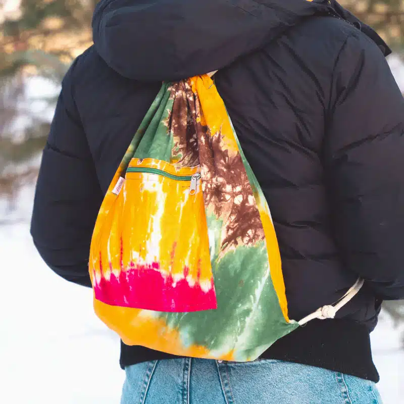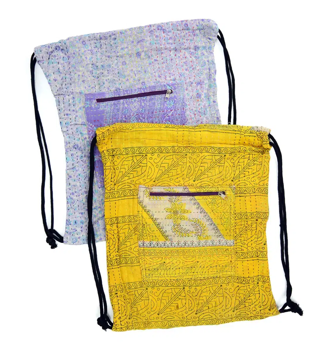 100% Cotton drawstring backpack with an 8" x 8" zippered exterior pocket. Unique colors and patterns available in a variety of cotton fabrics: Recycled Saris (Kantha), Tie dye, and Khadi fabric. Also, you can now CUSTOMIZE this bag. Email us if interested. Made in Bangladesh.