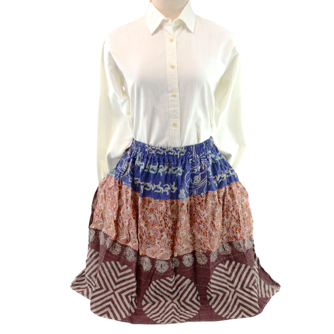 Upcycled saris are stitched together into beautiful Kantha Pocket skirts. Stretch band waist and two deep pockets. Variety of colors and patterns. Made in Bangladesh.