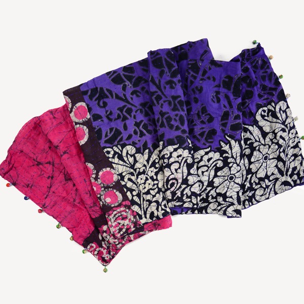 Gorgeous scarves made from upcycled saris. Comes in a plethora of designs and colors. Unique and trendy, these bold scarves are comfortable cotton. Beaded details on trim. 75" x 14". Made in Bangladesh.
