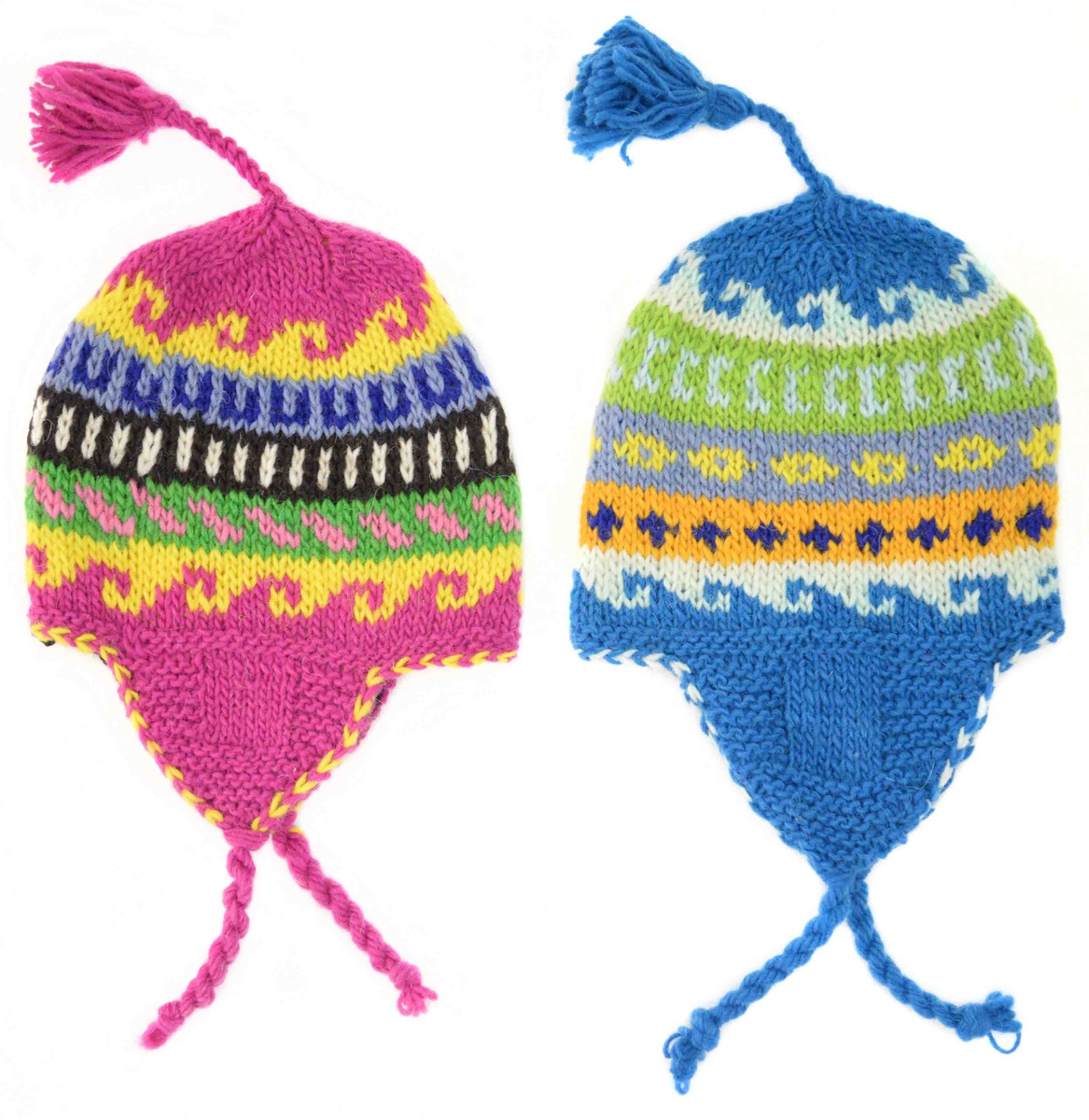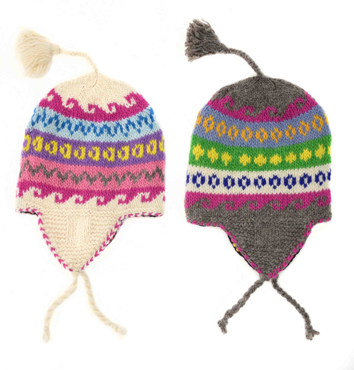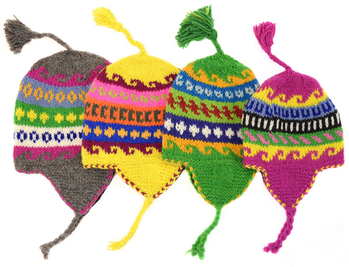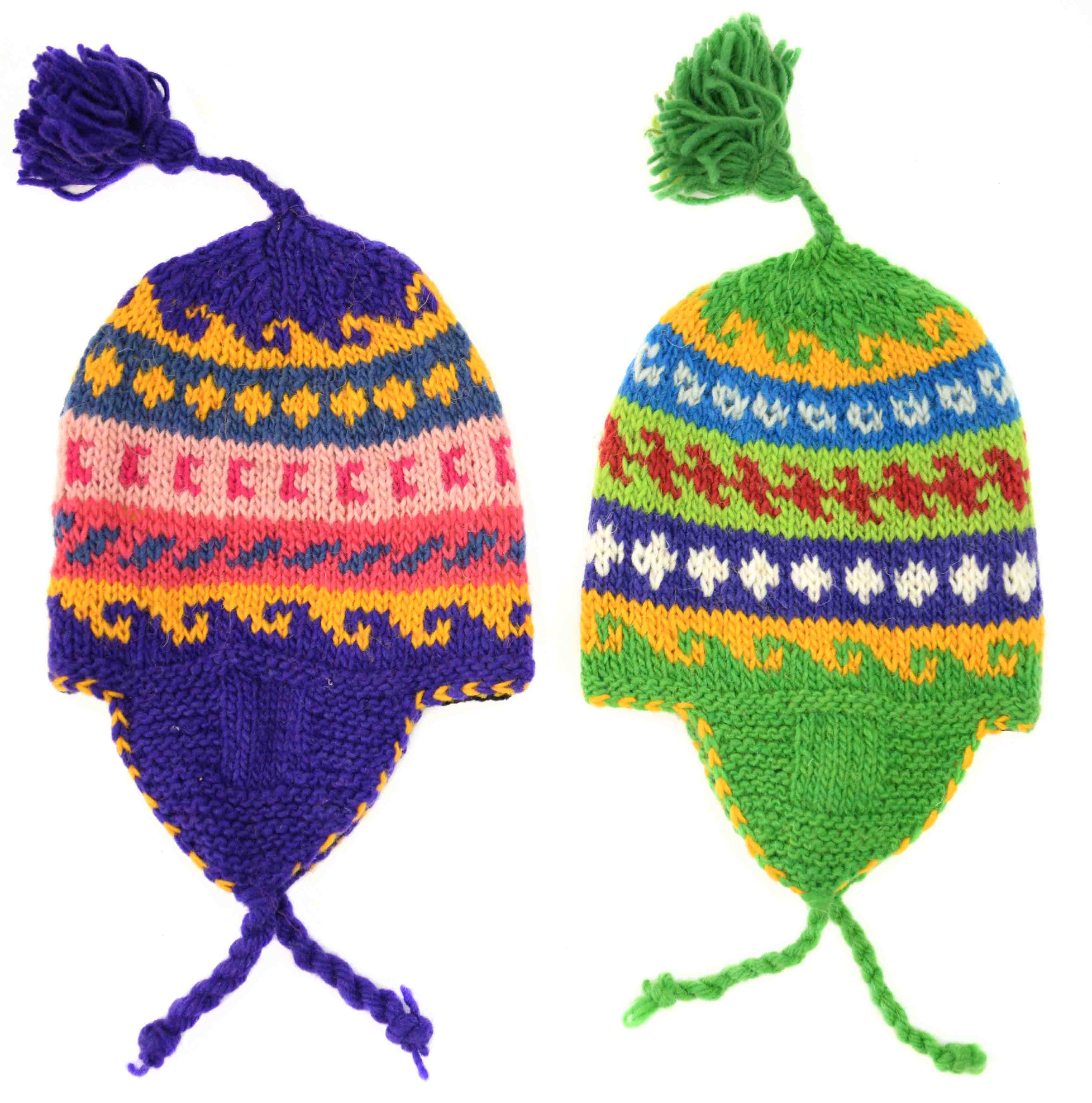 Hand-knit 100% Wool earflap hat with fleece lined interior. Sizes 0-3. Made in Perú.