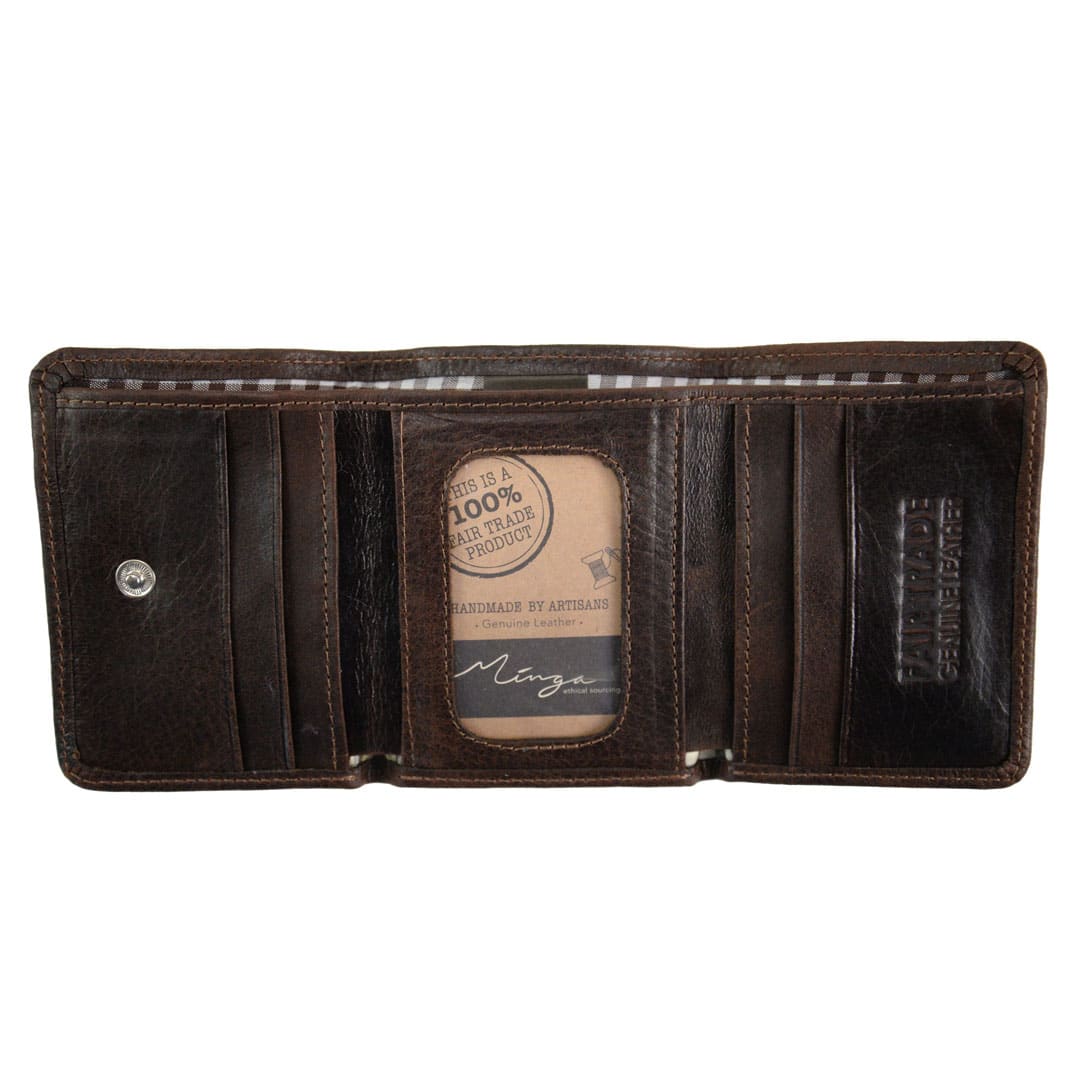 This simple and high quality leather trifold wallet makes for the best accessory. ID window, six interior card slots, two bill services, and snap closure. Available in various colors. Dimensions: 4.25" x 9.25" when open. Made in Ecuador.