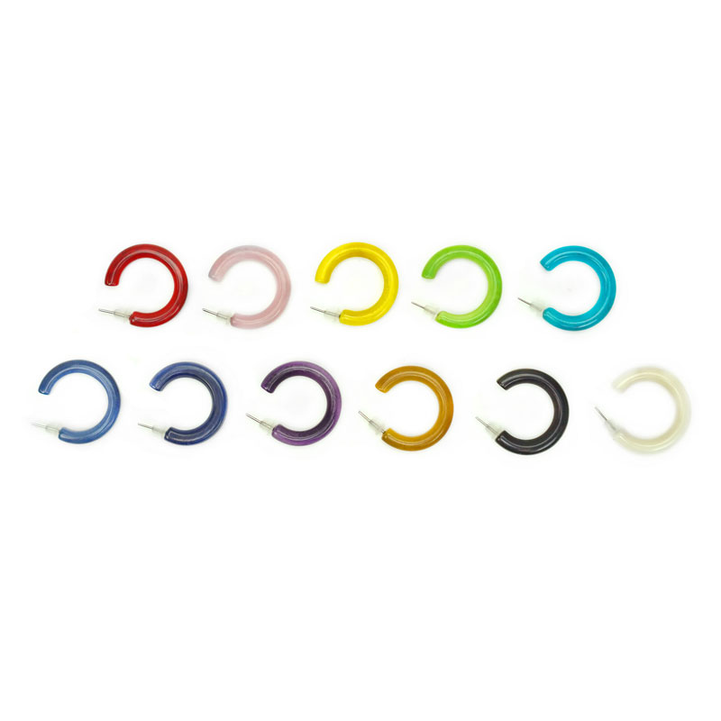 Colorfully dyed tagua hoops with hypoallergenic posts. Diameter: 9/10". Made in Ecuador.