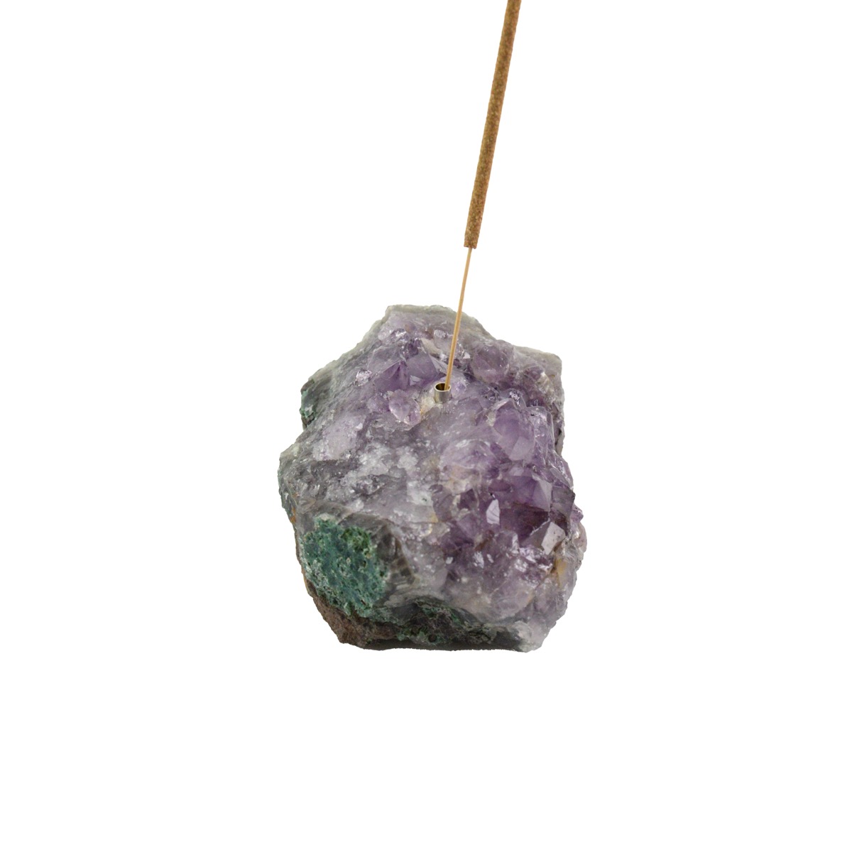 A natural stone crafted into a tasteful stick incense holder. Available as Amethyst, Agate, Green Quartz, and Pink Quartz. Made in Brazil.