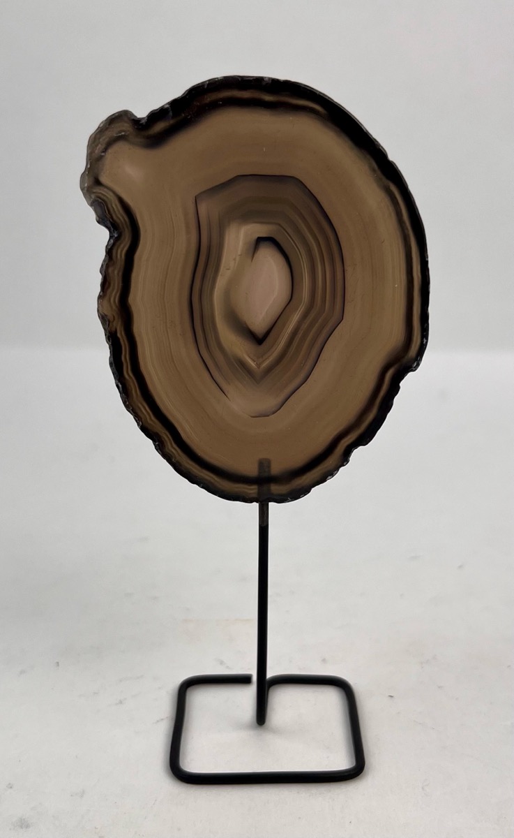 Beautiful agate slice on tasteful metal display stand. Made in Brazil
