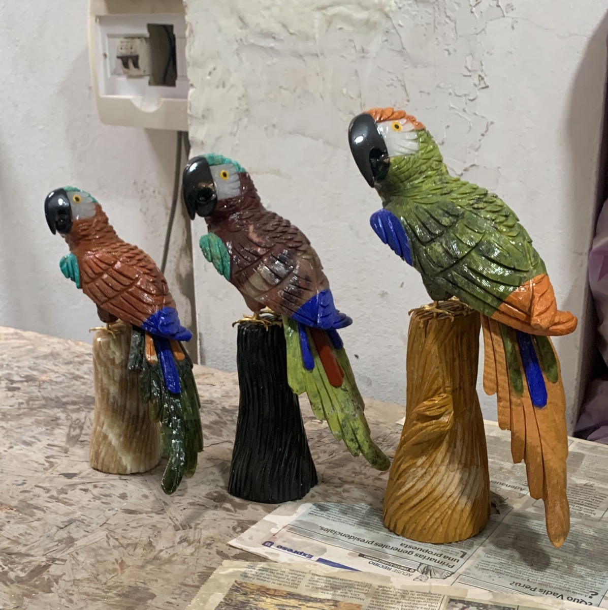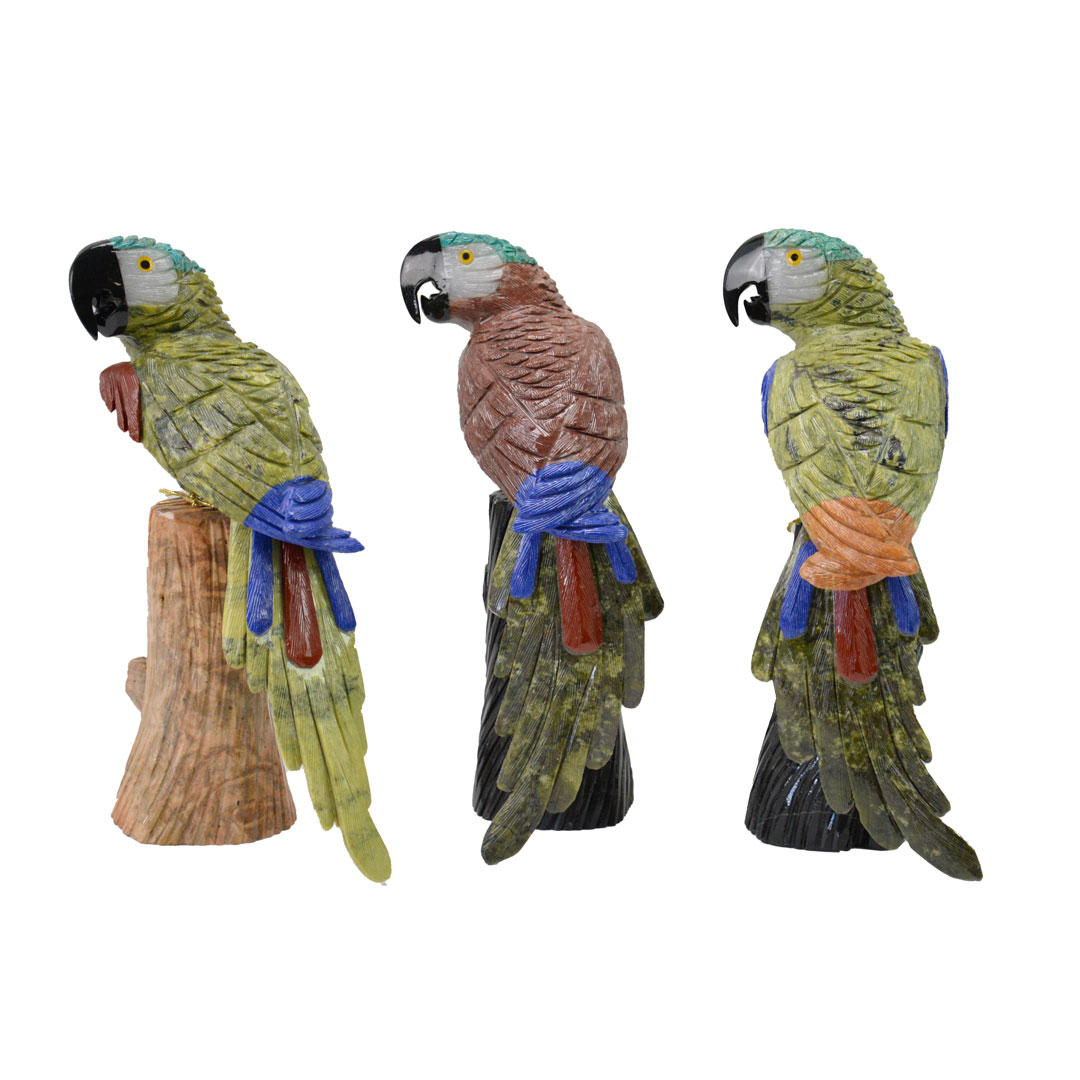 Stunning semiprecious stone parrot, 10"-11" tall. Pairs well with figurines and geological specimens increasing sell through. A statement piece both in store, and at home. Made in Peru.