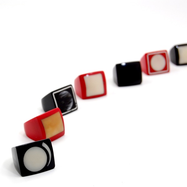 Tagua shavings are not discarded but rather made into a resin to make a ring. Bundle of 7 reconstituted tagua rings consist of a variety of sizes and designs in black and natural tagua color. Made in Ecuador.