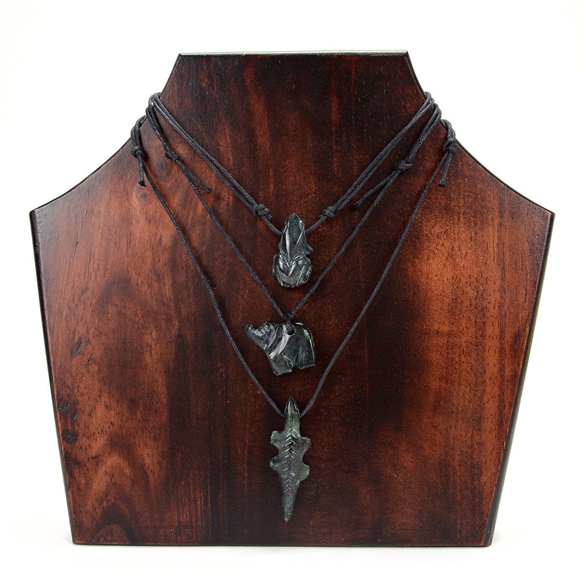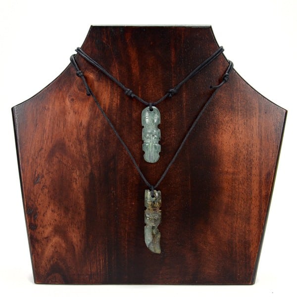 Small hand-carved serpentine pendants with a tribal feel. Adjustable sliding closure. Made in Ecuador.