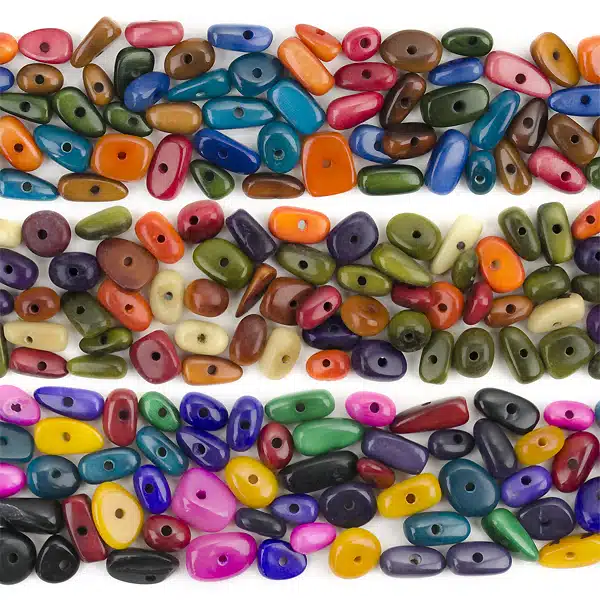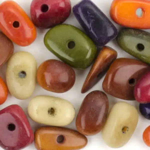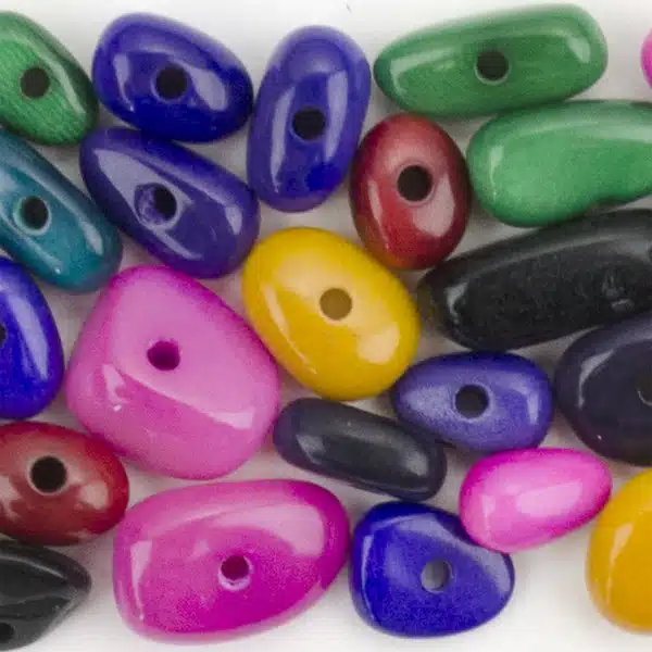 These small, richly dyed tagua beads are the same pebble shaped beads used to make our popular Tagua Rock Stretch Bracelets. Sold in bags of 100. Made in Ecuador.