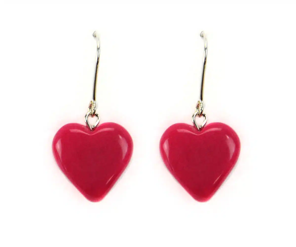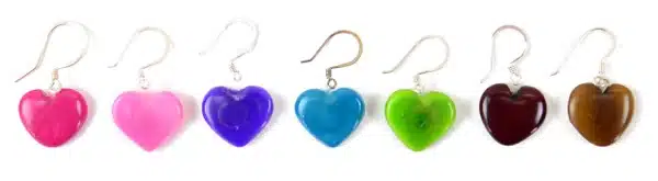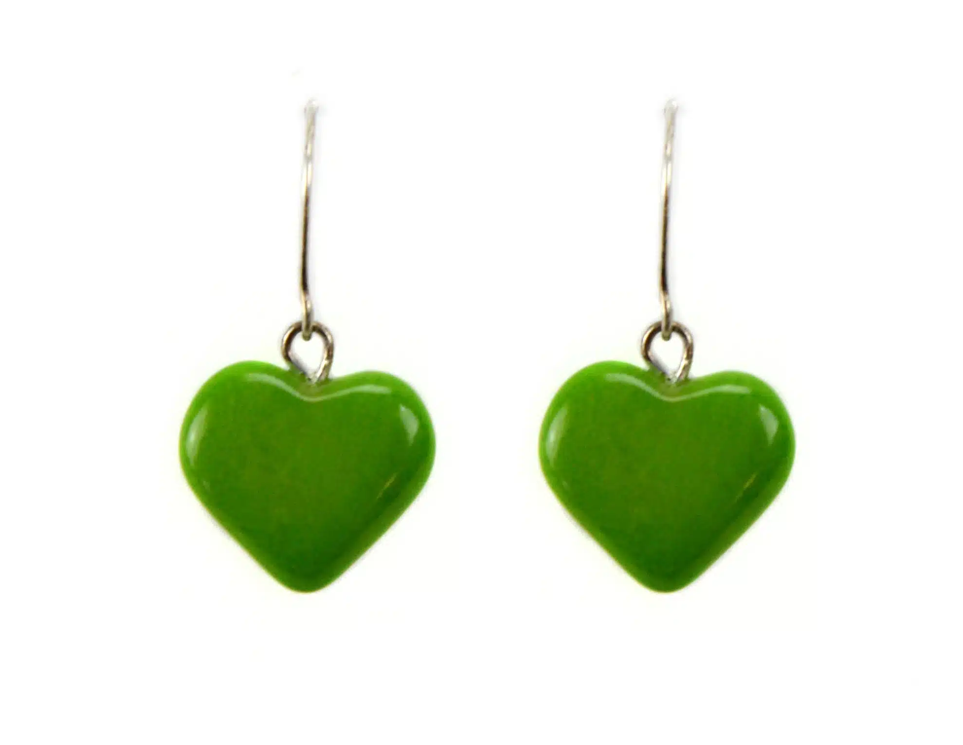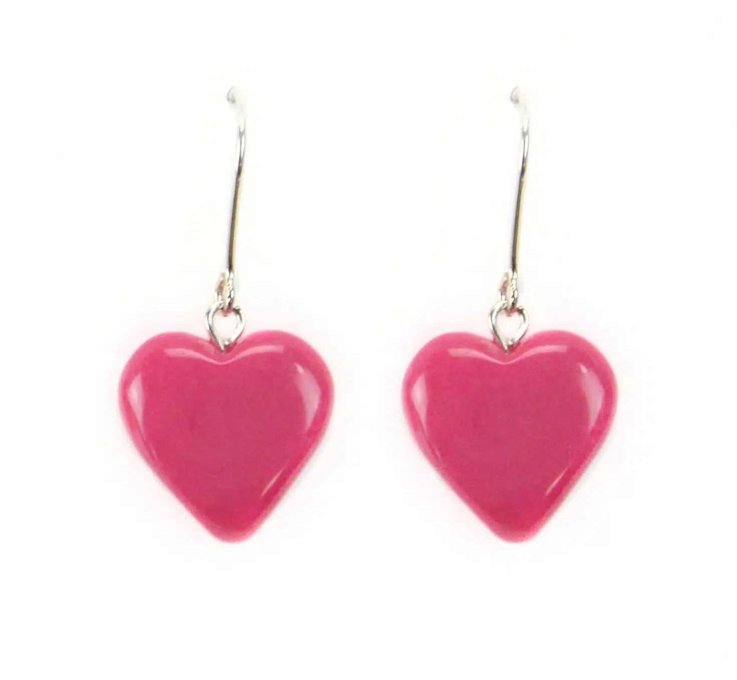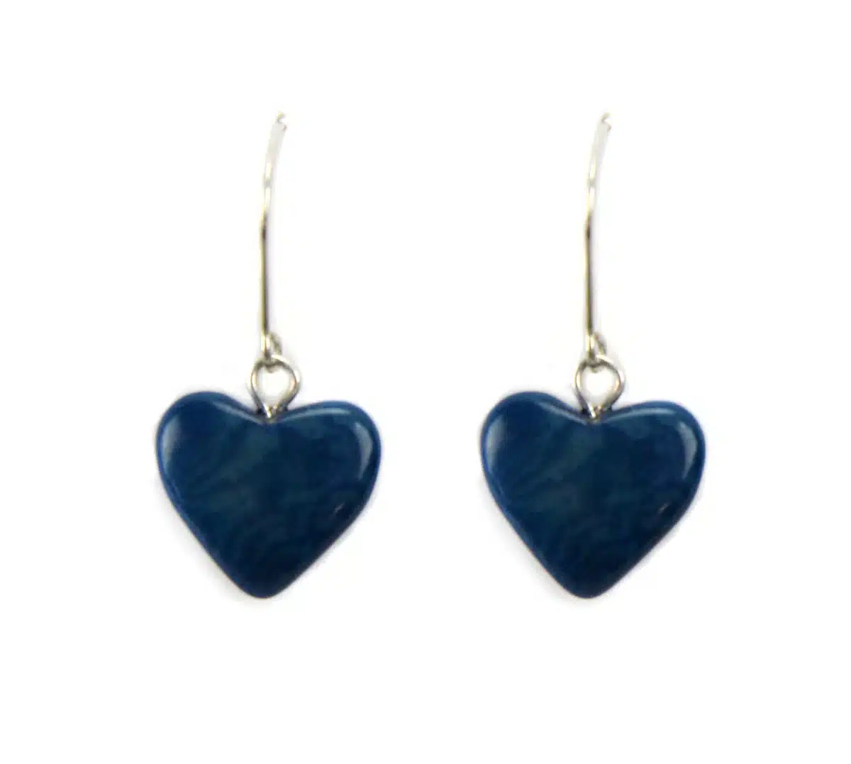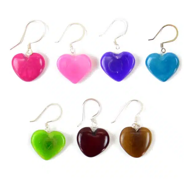 Carved and polished tagua hearts in a variety of colors. Sterling silver wires. Length: 1.25". Made in Ecuador.