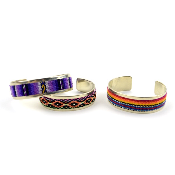 Our popular Textile Cuff is now available in two styles: flat and skinny. Great for a stacked boho look. Order a package and receive wide variety of vibrant fabrics. Width: 0.25-0.75".