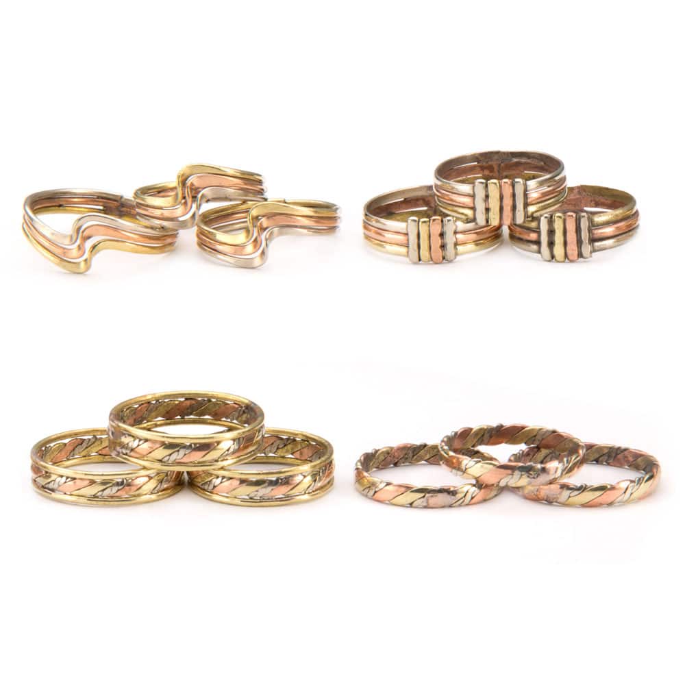 Tri-color rings made of copper, brass, and alpaca silver. Sized. Multiple styles available. Made in Perú.