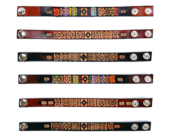 Leather bracelets with stamped designs and motifs. Adjustable snap closure. Made in Perú.