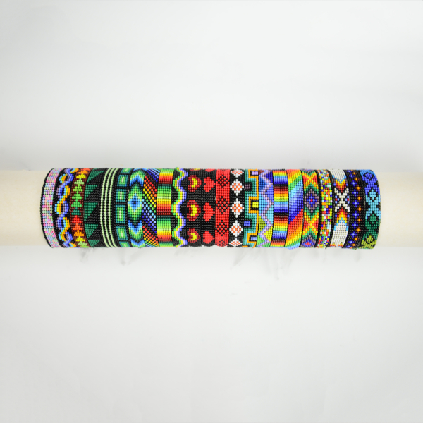 Adjustable loomed bracelets in a wide variety of designs with bold colors. Made in Ecuador.